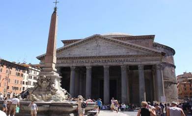 The Pantheon in Rome, built in 126 AD, with an ancient Egyptian obelisk in front, crowned with a cross. The mixture of ancient paganism and Christianity is most evident in modern Rome.