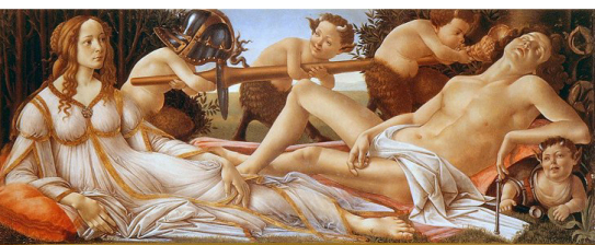 Mars is also named after the Roman god of warfare, Mars. It is named so because March was the month in the calender year that men could, after the cold of winter, once again resume the ancient habit of warfare. One of the great stories in the mythology is the union of Venus and Mars, the goddess of love and the god of warfare, both of whom represent the deeper and often more destructive passions of man. Poets and artists throughout the ages have enjoying depicting the two together, often in the few moments after they have had sex. One of my favorite depictions is that by the great Italian artist Botticelli, a man who knew how to paint beautiful women with a sensuality like few others have.